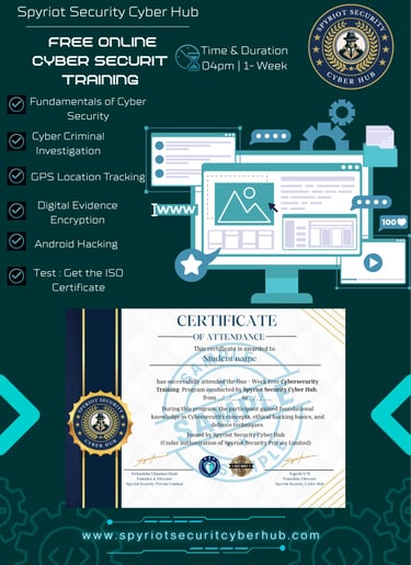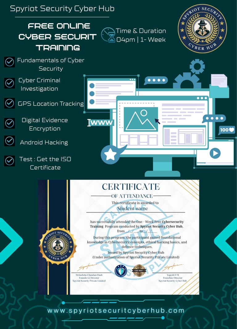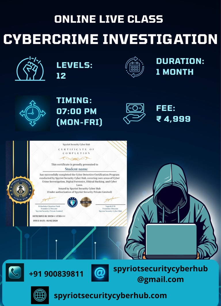Spyriot Security Cyber Hub successfully launched the Online Live Cyber Crime Investigation Course, focusing on Cyber Detective,Social Engineering and OSINT skills. The program includes 12 levels of practical investigation training conducted live from Monday to Friday at 7:00 PM. With a 1-month duration and a course fee of ₹4,999, participants receive a ISO Certificate and Detective ID Card. The initiative empowers learners to gain hands-on expertise in real-world cyber crime investigation techniques.